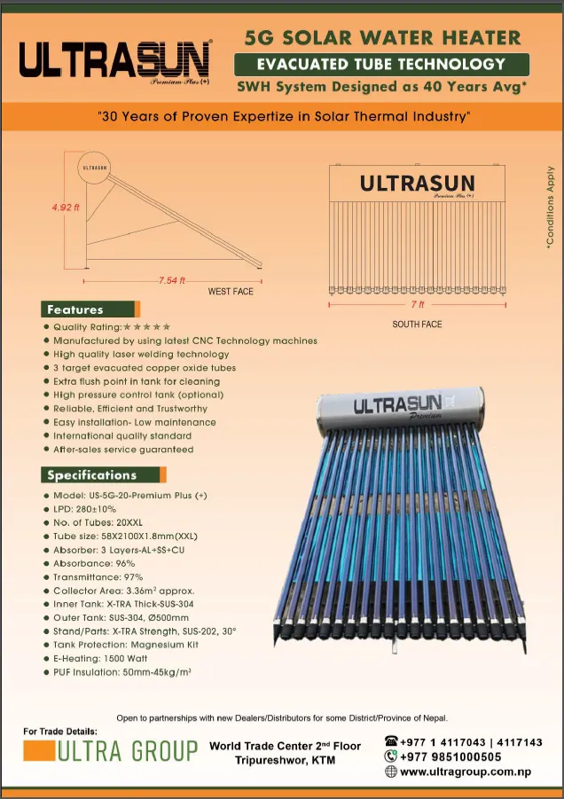 With over 30 years of trust and excellence, ULTRASUN stands as Nepal’s most reliable solar water heater brand, known for unmatched quality and a genuine 15-year performance warranty. The US-5G-20-Premium Plus(+) 280 LPD model is engineered using advanced CNC technology, high-precision laser welding, and premium 3-target evacuated copper oxide tubes for maximum heat absorption and superior efficiency. Built with an X-TRA Thick SUS-304 stainless steel inner tank, a strong SUS-202 stand, and 50mm high-density PUF insulation, it ensures powerful heating performance even in cold seasons. Installed by qualified solar technicians and supervised by engineers, ULTRASUN guarantees long-term reliability, low maintenance, and consistent hot water throughout the year. Backed by a nationwide service network, ULTRASUN continues to outperform competitors as the best solar water heater in Nepal—trusted by thousands of households for durability, efficiency, and exceptional service.